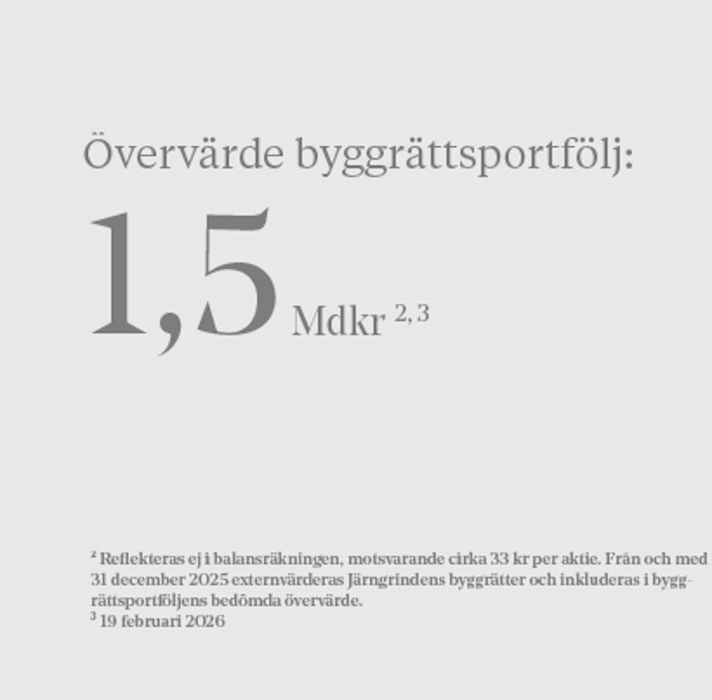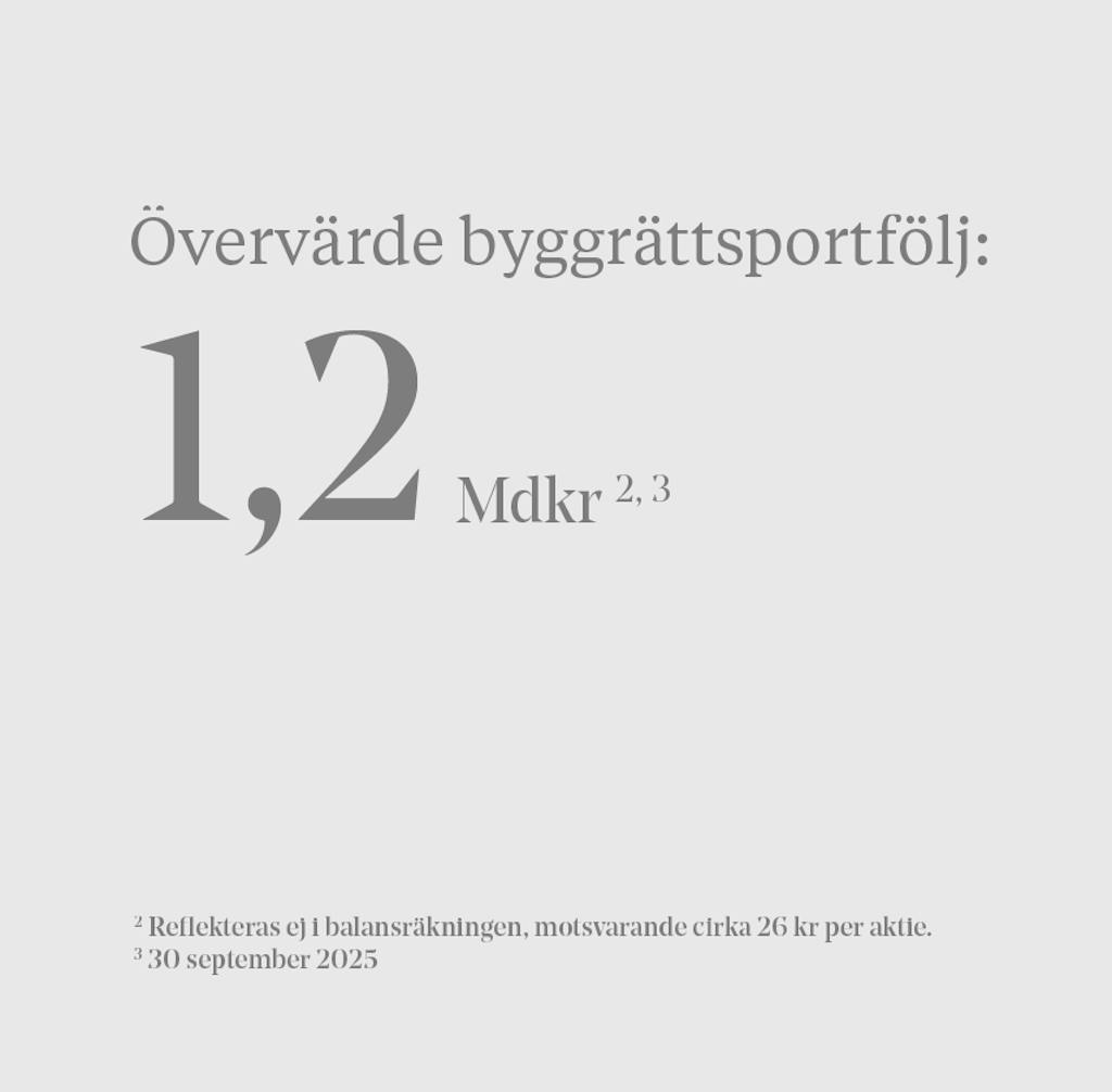 Genovas stora portfölj av egna byggrätter säkerställer koncernens långsiktiga tillväxt och en fortsatt stabil utveckling av fastighetsbeståndet. Byggrättsportföljen utgör samtidigt ett betydande värden som vi kan välja att realisera genom försäljning för återinvestering i högavkastande fastigheter eller kassaflödesfastigheter med utvecklingspotential för att stärka intjäning och kassaflöden.