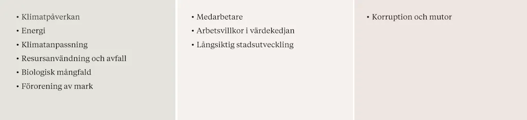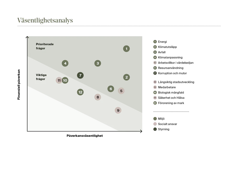 För att prioritera rätt frågor i hållbarhetsarbetet genomför Genova varje år en dubbel väsentlighetsanalys. Den visar vilka hållbarhetsfrågor som är mest betydelsefulla – både utifrån vår påverkan på omvärlden och hur hållbarhetsfrågor kan påverka bolagets utveckling. Resultatet ligger till grund för Genovas hållbarhetsramverk och de fokusområden som styr vårt arbete.