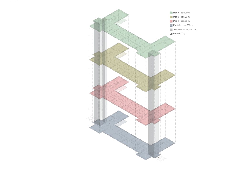 Varje våningsplan fungerar idag oberoende av de andra, men kan vid behov kombineras för att skapa större och sammanhängande ytor, en naturlig möjlighet för företag som planerar för expansiv verksamhet eller söker flexibla lösningar över tid.
