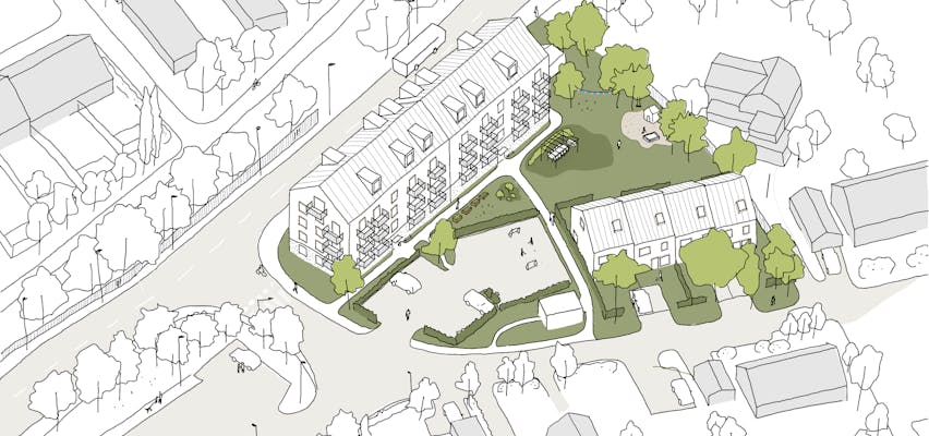 Den tidigare verksamhetstomten är idag ödslig och här vill vi istället utveckla fastigheten med ny bebyggelse bestående av både radhus och lägenheter som tillsammans skapar en trygg och trivsam boendemiljö. Vår ambition är som alltid att utgå från den specifika platsen och ta tillvara på dess naturliga förutsättningar. I planförslaget föreslås ett flerbostadshus mot Häradsvägen som bidrar till ett tryggt och attraktivt gaturum samt en grönskande förgårdsmark. Huset ges ett sammanhållet uttryck med kvalitet och omsorg i gestaltningen. Radhusen placeras mot Rödhakevägen och formar ett naturligt och samtida möte med kringliggande villabebyggelse.