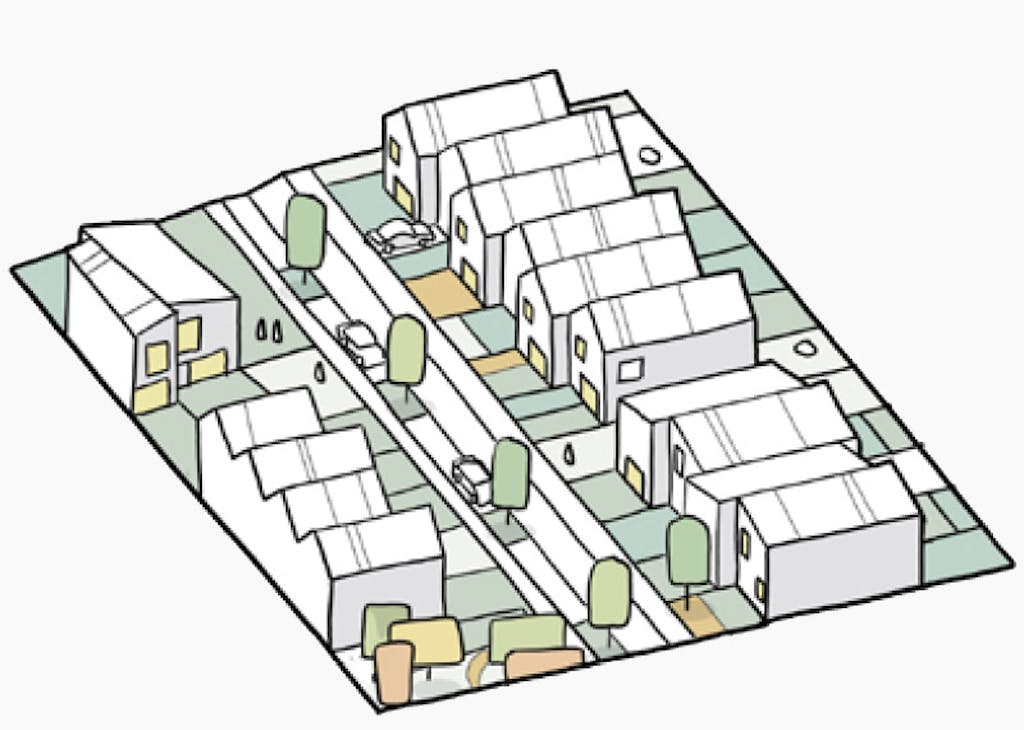 Den sista byggstenen är det som ofta listas först: bebyggelsen. Och visst är det viktigt, vad som byggs och hur det ser ut. Men det är helheten, hur byggstenarna komponeras och sätts samman som definierar kvaliteten på den stadsdel som möter både besökare och boende: hur husen möter marken, hur byggnaderna sig genom området, i vilka väderstreck gårdar och uteplatser förläggs. Tillsammans med en omsorgsfull gestaltning av de hus som ska byggas skapas ett ramverk för utvecklingen av Viby.