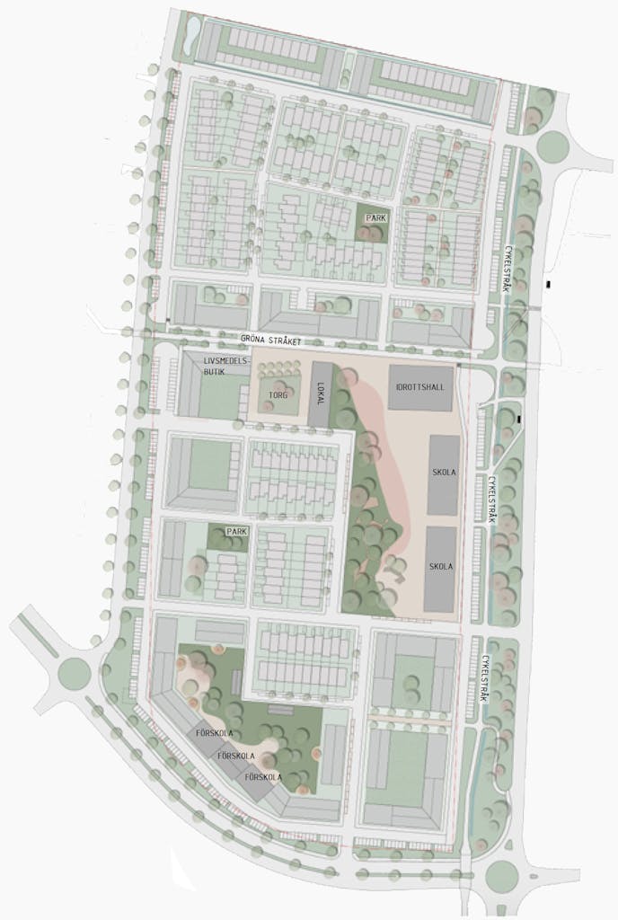 Stadsutveckling vilar på tre viktiga byggstenar: Gemensamma rum, stråk och bebyggelse. Det är med aktiva val för var och en av dessa byggstenar som Viby får sin form och stöd för genomförande.